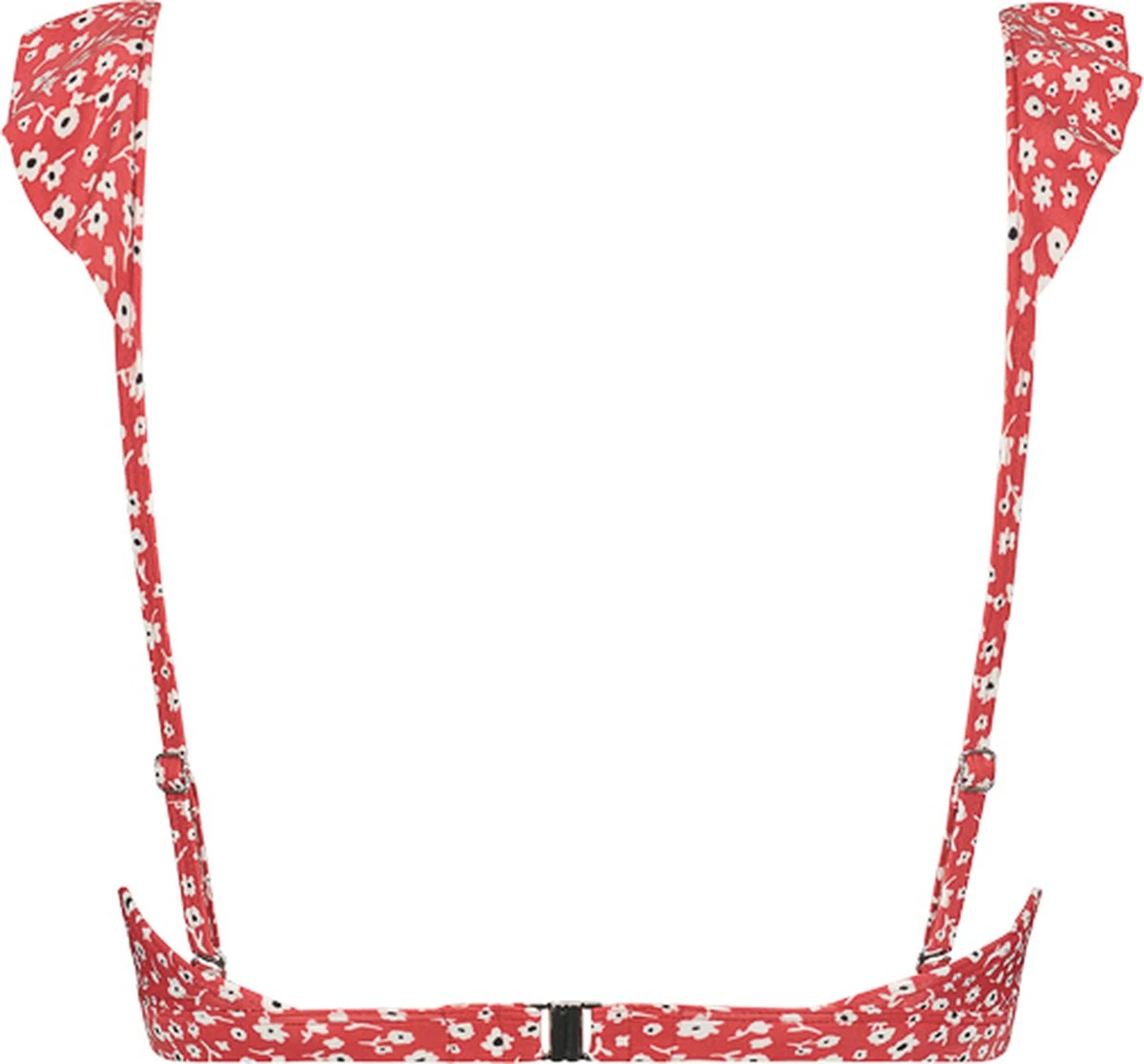 Ditsy Flower ruffle bikinitop met voorgevormde cups en beugel. De ruffles lopen van de schouderbandjes door over de cups. De top heeft verstelbare schouderbandjes en een metalen sluitclip op de rug.
