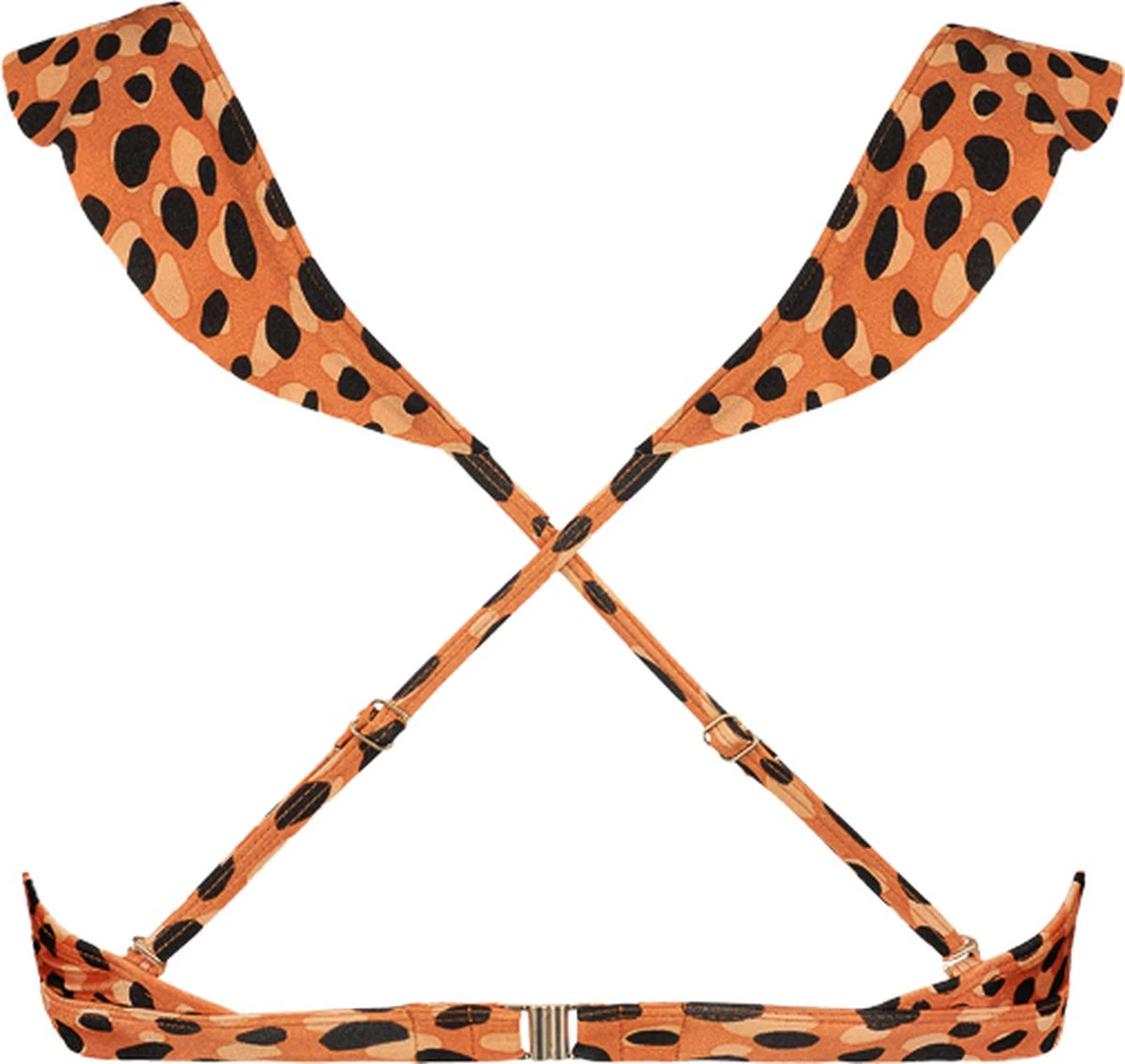 Beachlife Leopard Spots ruffle bikinitop met voorgevormde cups en beugel. De ruffles lopen van de schouderbandjes door over de cups. De top heeft verstelbare schouderbandjes en een metalen sluitclip op de rug.